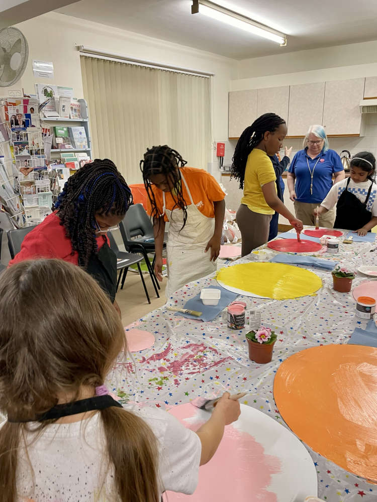 Children from the nursery visited Weybourne Care Home and members of the Thamesmead and Abbey Wood Branch of U3A at Abbey Wood Community Centre to explore plants and growth to develop ideas for the mural. Community painting sessions were also held with nursery families, care home residents, U3A members and the 6th Abbey Wood Brownies.
